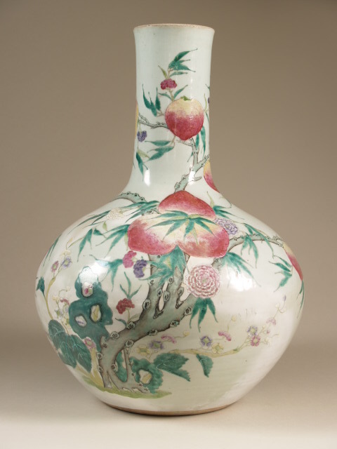 Vaas gedecoreerd in over het glazuur in roze, geel, groen, paars, zwart en bruin. Over het hele oppervlak een decor van perzikken aan takken in een landschap met rotsen en andere planten. Famille rose Perzikken zijn een gelukssymbool in China en worden geassocieerd met onsterfelijkheid. Ze zouden groeien in bomen die meer dan duizend jaar bloeien en staan in de bergen waar Xiwangmu leeft (de koningin van het Westen). De oosprong van deze vazen met perzikdecoratie ligt in het Yongzheng periode en werd voortgezet tijdens de regeerperiode van de keizer Qianlong. Ook op veel andere kunstvormen was de perzik een populair motief in deze periode. In de Qianlong periode zijn meer van dit soort vazen vervaardigd, al zijn ze alsnog zeldzaam en zeer fijn beschilderd. In de 19de eeuw werd het famillie rose pallette enorm populair in het Westen en daarmee ook deze vazen. Hierdoor zijn er veel perzikvazen bekend uit deze periode gemaakt voor de Westerse markt. De beschildering op deze vazen is minder verfijnd uitgevoerd, dit is met name duidelijk bij de uitvoering van de perzikken. Dat is ook het geval bij deze vaas, die vrij grof is uitgevoerd vergeleken met de originelen. On de onderkant... (Nederlands)