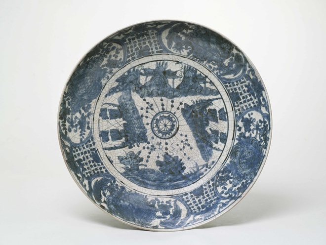 Schotel van porselein, beschilderd in onderglazuur blauw. Op het plat een windroos omgeven door uitstralende lijnen. Hie...h century; they were part of a specific Western tradition of mapping known as portu...||Zhangzhou||Princessehof GRV 1929016 |