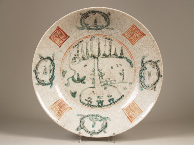 Schotel beschilderd in rood, zwart en turkoois. Op het plat een waterlandschap met bergen, mensen in bootjes en twee paviljoens die gescheiden worden door een 'bubbel'. In deze bubbel zijn drie paviljoens afgebeeld. Op de rand zijn vier rode zegels met een onleesbaar schrift. Deze worden afgewisseld met mediallons gevuld met waterlandschappen. Deze decoratie combineert Daoïstische en Confucianistische tradities en de bergen referen waarschijnlijk naar het paradijs. De bubbel is een manier van verwijzen naar een droom, fantasie of andere werkelijkheid die vaker in de Chinese kunst en Daoïtischt traditie werd gebruikt. Dit decor staat ook wel bekend als 'split pagoda'. Zhangzhou keramiek beleefde zijn hoogtepunt van 1550 tot 1650. Het werd op grote schaal geproduceerd voor de zuidoost Aziatische markt en was ook populair in Japan. Het porselein is over het algemeen een grover dan dat van Jingdezhen en vaak bevinden er zich zandresten uit de oven op de bodem. De decoraties zijn losser geschilderd met een grotere variëteit aan kleur. Zhangzhou keramiek stond voorheen bekend als 'Swatow', deze naam is ontleend aan de havenplaats vanwaar veel van dit soort keramiek werd verhandeld... (Nederlands)
