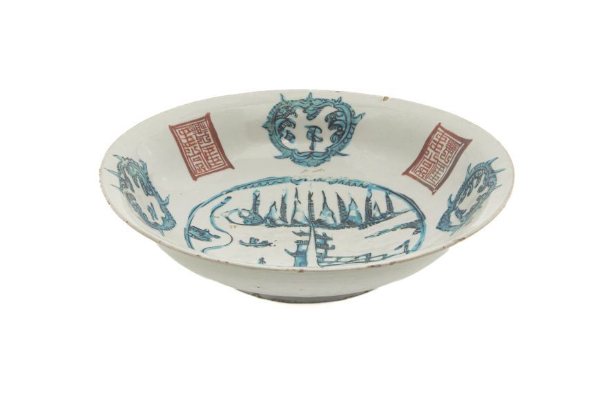 Schotel beschilderd in rood, zwart en turkoois. Op het plat een waterlandschap met bergen, mensen in bootjes en twee pav...w', deze naam is ontleend aan de havenplaats vanwaar veel van dit soort keramiek we...||Zhangzhou||Princessehof GRV 1929064 |