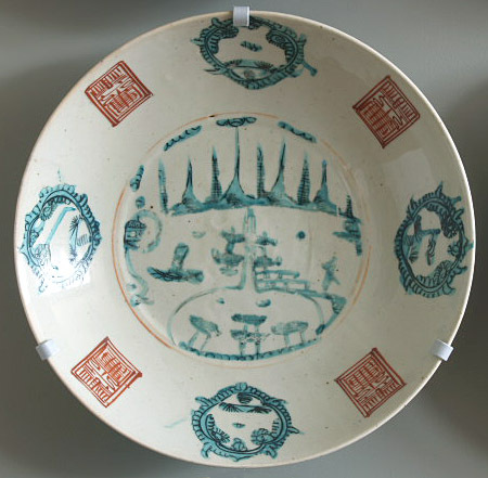 Schotel beschilderd in rood, zwart en turkoois. Op het plat een waterlandschap met bergen, mensen in bootjes en twee paviljoens die gescheiden worden door een 'bubbel'. In deze bubbel zijn drie paviljoens afgebeeld. Op de rand zijn vier rode zegels met een onleesbaar schrift. Deze worden afgewisseld met ruyi-vormige mediallons gevuld met waterlandschappen. Deze decoratie combineert Daoïstische en Confucianistische tradities en de bergen referen waarschijnlijk naar het paradijs. De bubbel is een manier van verwijzen naar een droom, fantasie of andere werkelijkheid die vaker in de Chinese kunst en Daoïtischt traditie werd gebruikt. Dit decor staat ook wel bekend als 'split pagoda'. Zhangzhou keramiek beleefde zijn hoogtepunt van 1550 tot 1650. Het werd op grote schaal geproduceerd voor de zuidoost Aziatische markt en was ook populair in Japan. Het porselein is over het algemeen een grover dan dat van Jingdezhen en vaak bevinden er zich zandresten uit de oven op de bodem. De decoraties zijn losser geschilderd met een grotere variëteit aan kleur. Zhangzhou keramiek stond voorheen bekend als 'Swatow', deze naam is ontleend aan de havenplaats vanwaar veel van dit soort keramiek we... (Nederlands)