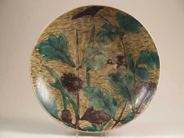 Schotel met een decor van van bloeiende planten (chrysanten?) in groen en mangaan-paars uitgevoerd op een gele achtergrond met zwarte golven/spiralen. Op de achterkant bevindt zich een groen-zwart stempel met de karaktes 'fuku', wat een gelukswens is. In Arita wordt vanaf het begin van de 17de eeuw begonnen met de productie van porselein. In deze eerste fase bestaat dit nog voornamelijk uit blauwwit porselein, vanaf ongeveer 1640 gaat men experimenteren met kleuren over het glazuur. In o.a. de Yambeta ovens wordt dit type kleurrijke type keramiek gemaakt in zgn. drakenovens, deze schotel daar ook waarschijnlijk vervaardigd. De keramiek werd in (bijna) verticale positie gebakken, wat soms nog zichtbaar is door wat kleine beschadigingen aan de rand van borden/schotels. Dit type porselein staat bekend als 'kutani' en in dit geval Ao-kutani (Ao = groen). De naam verwijst naar een plaats op het eiland Honshu gelegen in de Ishikawa Prefecture. Dit gebied werd bestuurd door de Maeda familie. In de 19de eeuw vond hier een heropleving plaats van de kutani productie. Er wordt ook aangenomen dat de Maeda familie opdracht gaf tot de productie van het 17de-eeuwse kutani porselein en om ... (Nederlands)