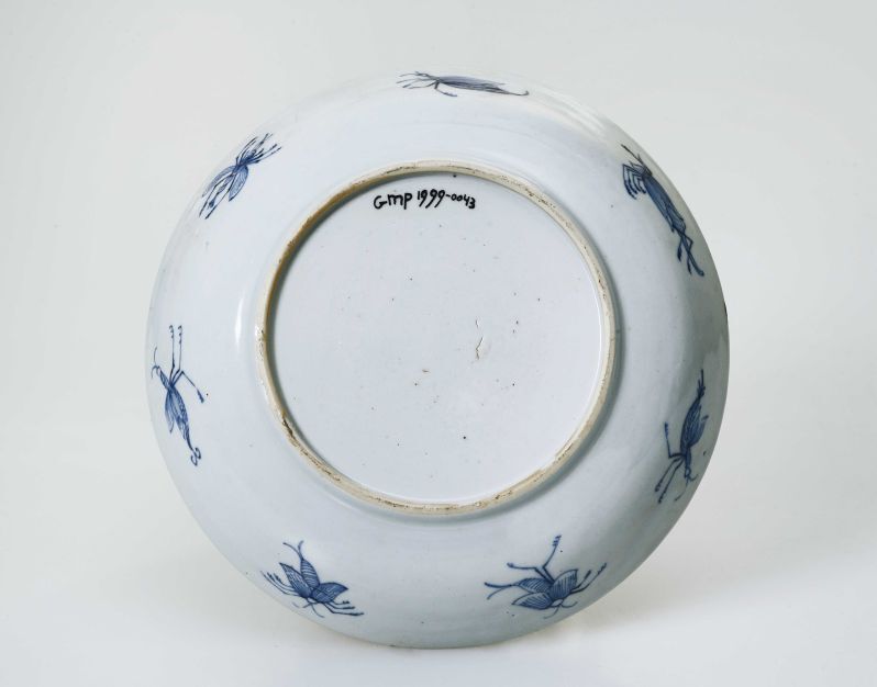 Bord beschilderd in onderglazuur blauw en op het glazuur in rood, geel en goud. Op het plat een decoratie van de Parasoldames naar ontwerp van Cornelis Pronk. Te zien zijn twee dames, waarvan een dame een parasol in haar hand houdt en de andere wuift naar drie vogels tussen het riet voor hen. Daaromheen een rand met bloemranken. Op de wand acht cartouches met daarin om en om een vrouw en een vogel tegen een honingraatpatroon. Vergulde rand. De achterzijde van de wand is gedecoreerd met zeven insecten. Imari. Cornelis Pronk (1691-1759) was een Amsterdamse kunstenaar bekend om zijn portretschilderingen en topografische tekeningen. In 1734 kreeg hij een opdracht van de VOC voor het maken van enkele ontwerpen voor de decoratie van porseleinserviezen. In totaal maakte Pronk rond de vier ontwerpen tussen 1734 en 1736. Deze ontwerpen combineerden Chinese/Japanse elementen met Europese taferelen en staan bekend als Chinoiserie decors. Uit het overgebleven Pronk porselein blijkt dat dat deze ontwerpen zowel in China als in Japan gebruikt werden voor de decoratie van porselein. In totaal zijn (minimaal) vier ontwerpen bekend: waaronder de Parsoldames, de Dokters en het Prieel, de Handwas... (Nederlands)
