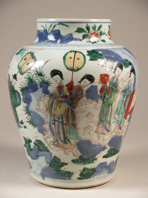 Pot beschilderd in onderglazuur blauw en over het glazuur in rood, geel, zwart, aubergine en groen. De pot is over het geheel gedecoreerd met een landschap van rotsen, planten en bloemen, vrouwen en een man omgeven door wolken. De vrouw in de gele jurk houdt een kind in haar armen terwijl de vrouw achter haar een waaier vasthoudt. De vrouw rechts van haar in de groene jurk houdt een doos vast en de vrouw naast haar een vlag/wimpel. Links van de vrouwen staat een man met achter zich een vrouw die een waaier vasthoudt. Op de schouder bevindt zich een gecraqueleerde band en op de hals rotsen en bloemen. Wucai De vrouw in de gele jurk stelt waarschijnlijk Chang-E, de godin van de maan, voor. Tijdens haar leven stal en dronk zij het elixer van onsterfelijkheid van haar man Yi de boogschutter. Hij had het elixer gekregen van Xi Wangmu, Koningsmoeder van het westen. Toen Yi hierachter kwam vluchtte Chang-E naar de maan, waar ze sindsdien voor eeuwig woont vergezeld door een konijn. Er zijn verschillende verhalen over Chang-E, de scène op de vaas verwijst waarschijnlijk aan een bezoek van de keizer Xuangzong (712-756), ook bekend als Minghuang. Zijn favoriete concubine Yang Guifei (7... (Nederlands)