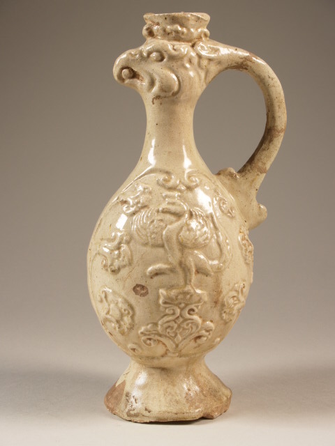 Kan bedekt met wit glazuur en een schenktuit in de vorm van een fenikshoofd. Op de buik is een reliëfdecoratie aangebrac...veren objecten van de Sogdische cultuur uit deze periode (zie ook https:...||China||Keramiekmuseum Princessehof BP 2007-074