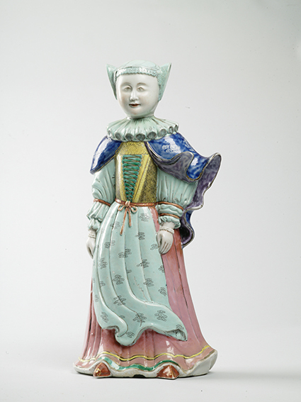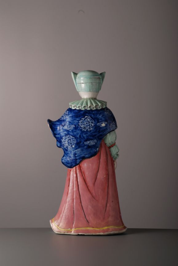 Beeld in de vorm van een Joodse vrouw beschilderd in onderglazuur blauw en over het glazuur met roze, rood, oranje, groen, zwart en geel. De vrouw draagt een rok met schort en een bovenstuk (brusttuch) met lange mouwen. Daarover draagt ze een cape en om haar nek molensteenkraag en een witte muts (kupke). Op de cape en de jurk zijn Chinese decoraties zijn aangebracht van abstracte wolken en archaïsche drakenmedaillons. Van deze beeld zijn in totaal tien voorbeelden bekend. Er is ook een beeld van een Joodse man, daarvan zijn vier exemplaren bekend. Voorheen werd de twee plastieken samen beschreven als Mr. en Mrs. Duff. Er werd aangenomen dat de figuren gebaseerd waren op het achttiende-eeuwse echtpaar Durven; een Bataafse gouverneur-generaal van de VOC en zijn echtgenote. De plastieken zijn echter waarschijnlijk gebaseerd op tekeningen van Joodse mensen die staan afgebeeld in het het boek Neu-eröffnete Welt-Galleria (1703): 'Franckfurther Jud und Jüdin' en 'Ein Bolnishcer Jud'. De prenten zijn getekend door de Caspar Luyken (1672-1708) voor een Duitse opdrachtgever. In het boek worden mensen van verschillende soorten beroepsgroepen, religies en etniciteit getoond met ieder hun ... (Nederlands)