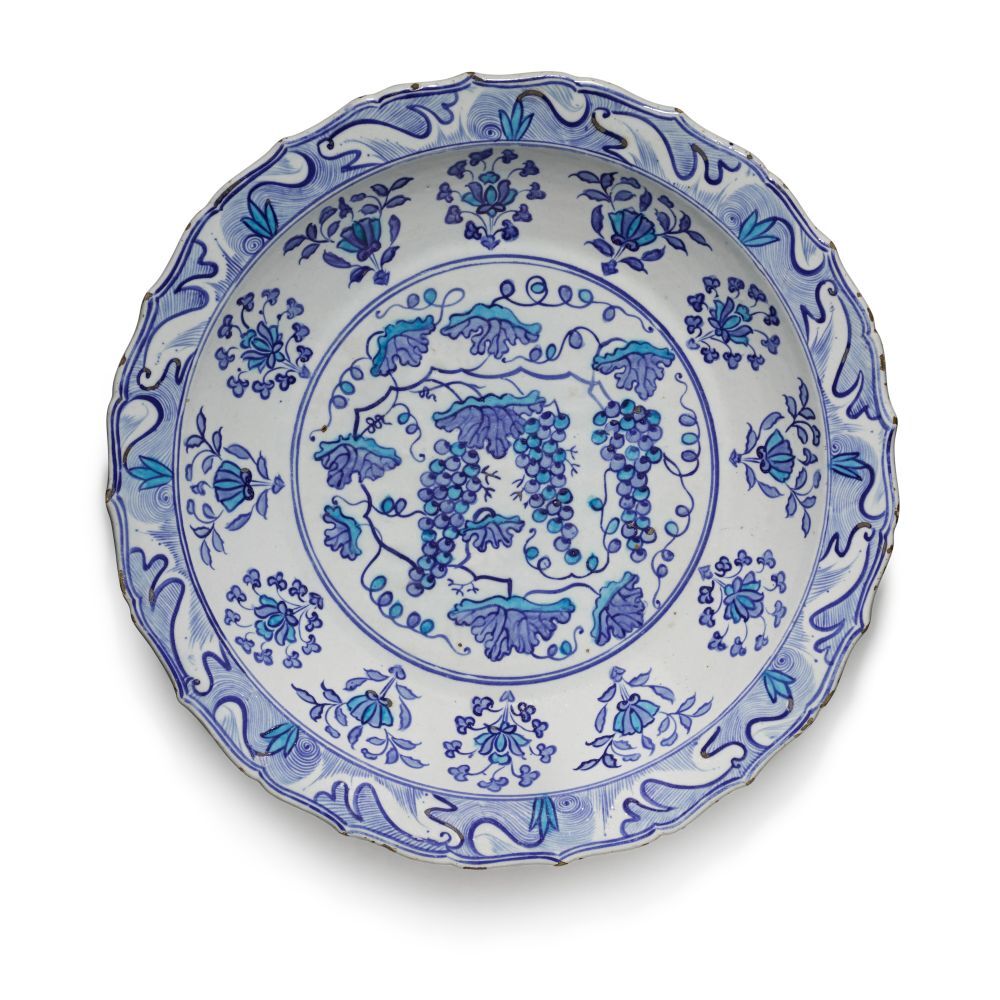 Grote schotel met gelobde rand en beschilderd in onderglazuur blauw en turkoois. Op het plat binnen een dubbele cirkel een decoratie van druivenranken. Op de wand twaalf bloemtakken en op de rand een band van abstracte golven. De wand op de achterzijde heeft wederom twaalf bloemtakken en op de bodem zijn cirkels aangebracht. De voetring is ongeglazuurd. Op het plat zijn proenafdrukken zichtbaar. Iznik Dit is de grootst bekende Iznik schotel gedecoreerd met druiventakken. De stijl imiteert vergelijkbaar Chinese blauw-wit porselein gemaakt tijdens vroege Ming dynastie. De decoratie van druiventakken door Inzik ambachtslieden werd populair in de jaren 1530-1540. Het Iznik druivenpatroon is t.o.v. de Chinese versie omgekeerd aangebracht, wat suggereert dat transfer prints werden gebruikt om de decoraties aan te brengen. Mogelijk werden deze (geponste voorbeelden) aangeleverd door ambachtslieden die werkzaam waren in de kitabkhana ateliers. De decoratie van dit exemplaar volgt vrij trouw het origineel zoals o.a. bekend uit de Yongle periode. Al zijn de bloemen meer abstract van vorm (op het Chinees porselein zijn de amellia, chrysant, gardenia, hibiscus of azalea, lotus en pioenroos ... (Nederlands)