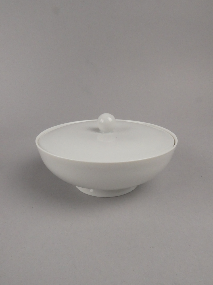 Witte suikerpot, platte deksel met ronde dekselknop. De suikerpot is onderdeel van Koffieservies Mosa bestaande uit: twee kop-en-schotels, een mokkakan, een koffiekan, melkkan en suikerpot. (Nederlands)