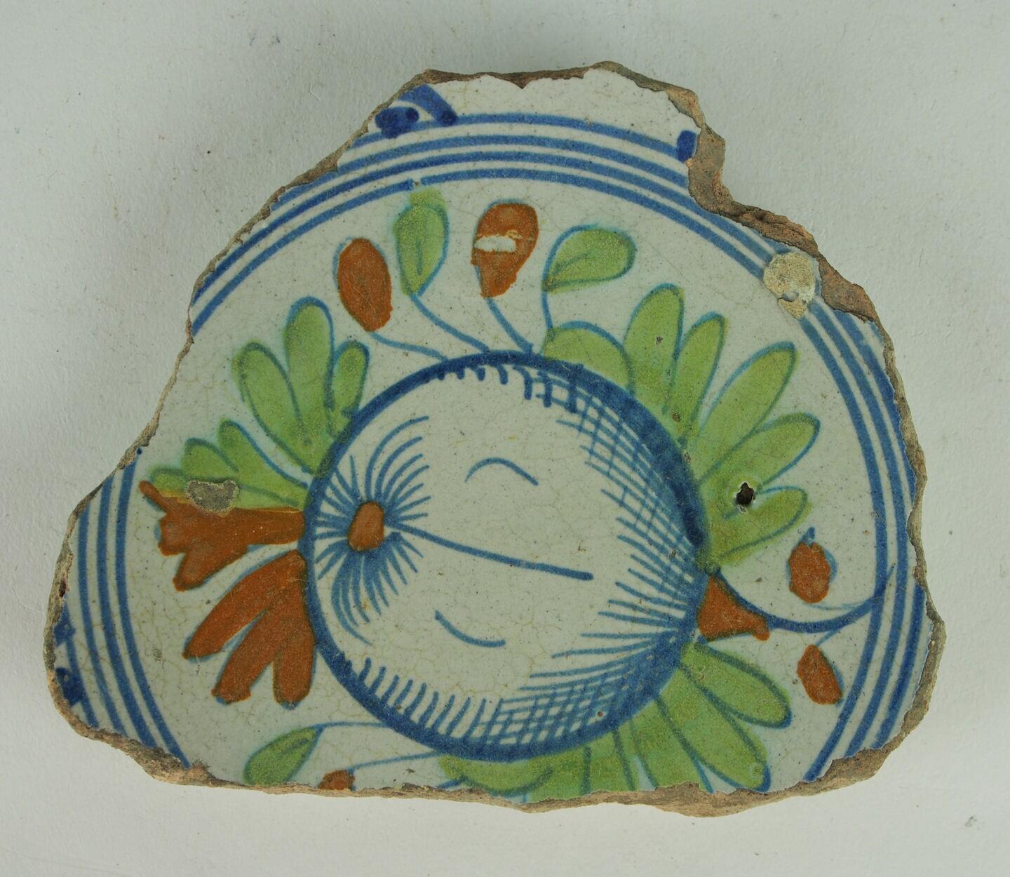 Fragment van een majolica schotel met op het plat een geschilderde vrucht met bladeren in oranje, groen en blauw. (Nederlands)