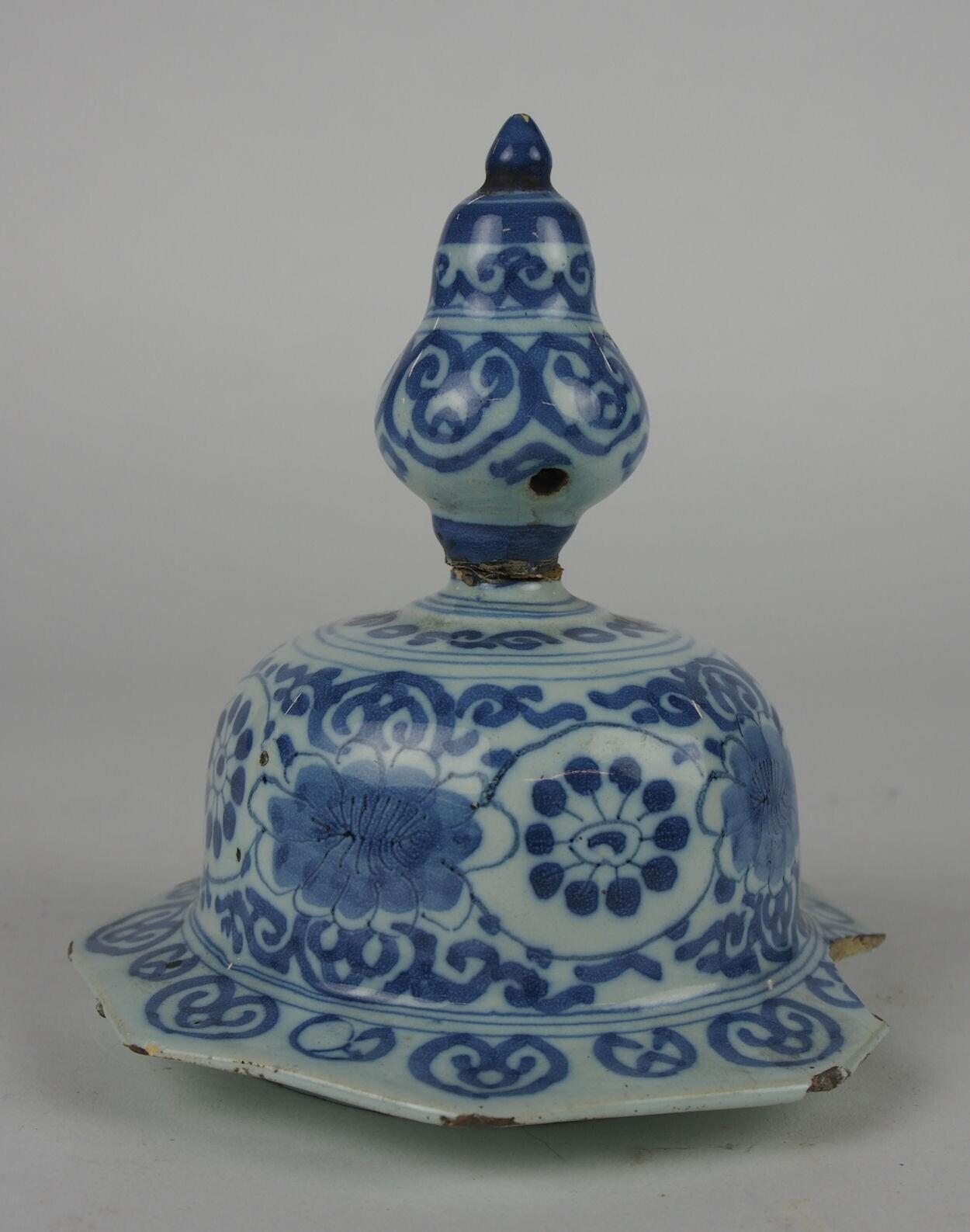 deksel met een afgebroken knop. Stukken afgebroken aan de rand. (Nederlands)