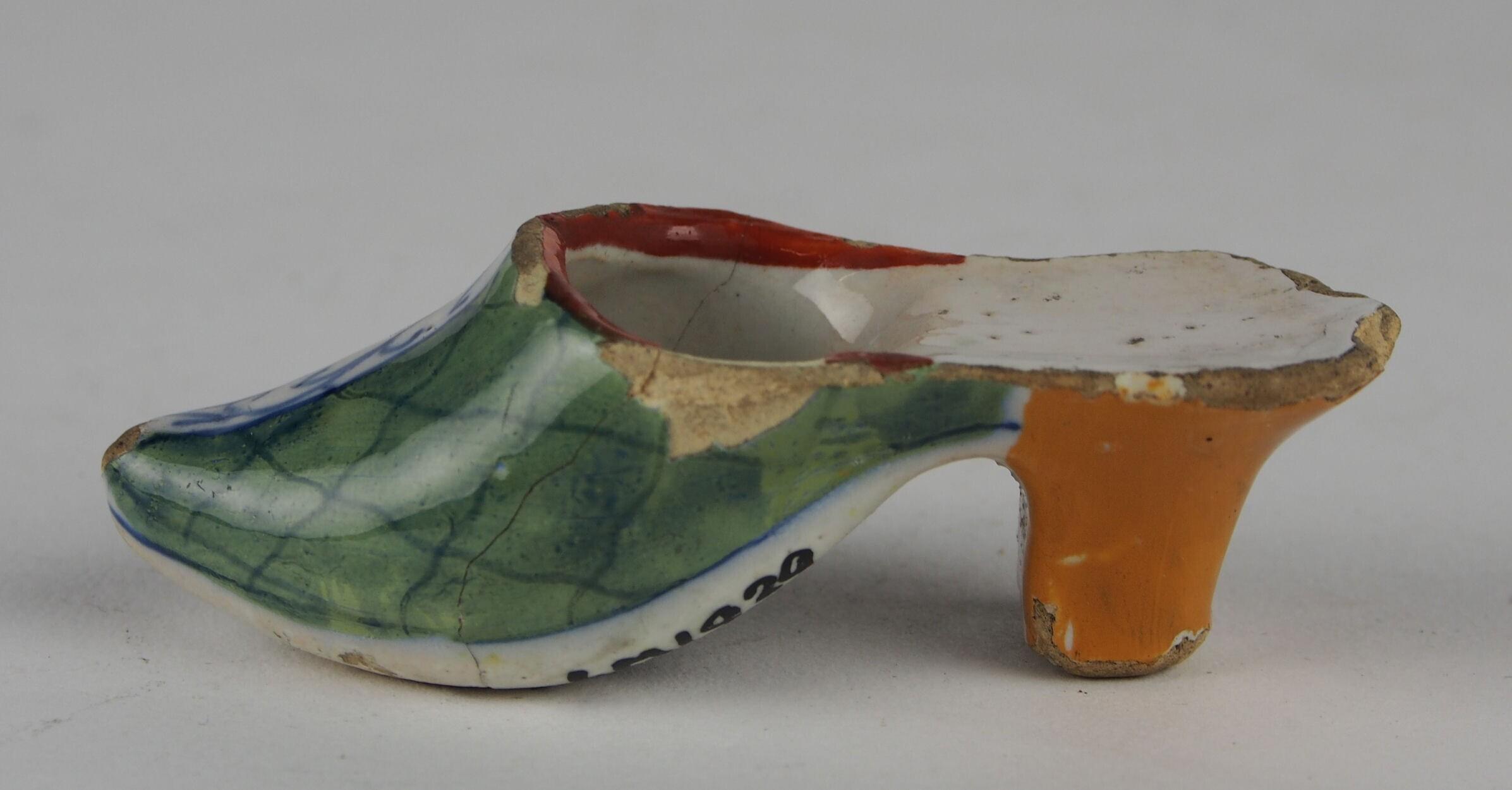 Veelkleurig beschilderde muil van faience, gedecoreerd met een ruitmotief. Schade aan de randen. (Nederlands)