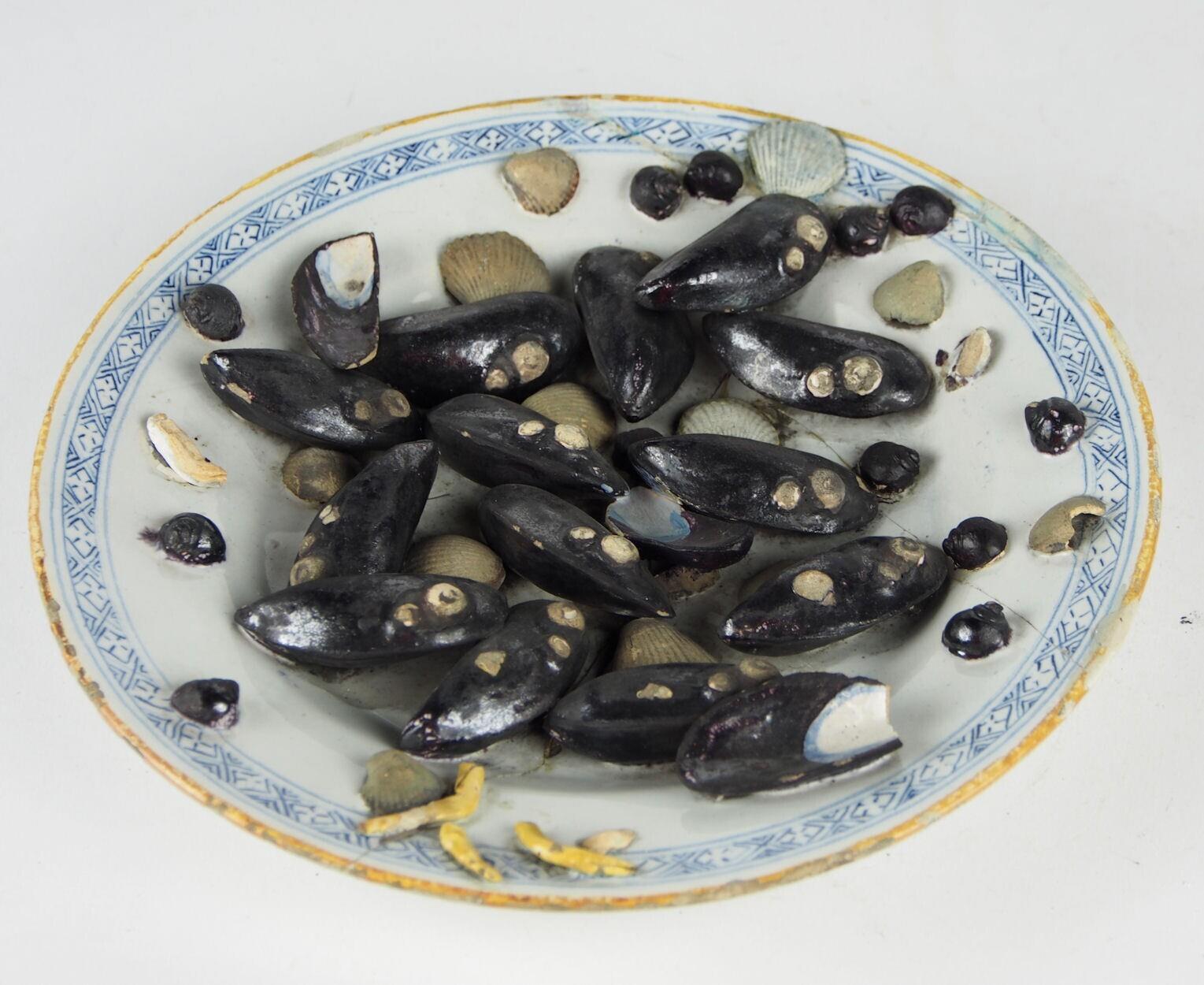 Bord met op het plat gemodelleerde mosselen en schelpen geappliqueerd. Rand versierd met geometrische motieven in blauw. Heeft enkele herstelde breuken. (Nederlands)
