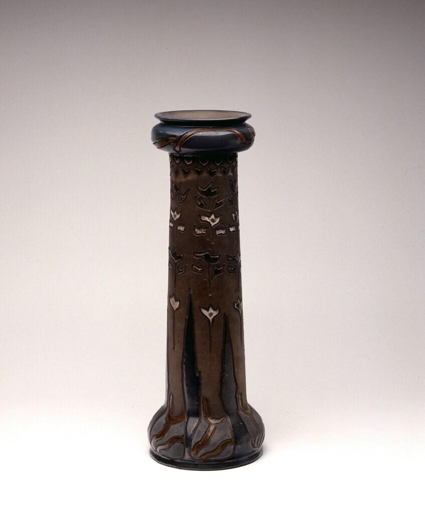 Hoge cilindervormige vaas met een verdikking onder de uitbuigende liprand, op een bol uitlopende voet. Ingekraste decoratie van florale motieven, in blauw, bruin, lichtgroen, zwart en wit Reflet Métallique. (Nederlands)