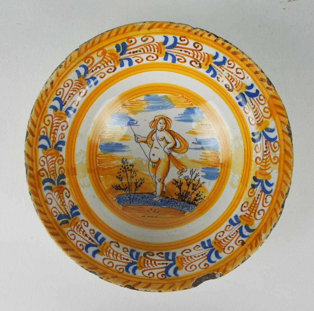 faience ; tinglazuur ; loodglazuur (kwaart) ; achterzijde onbeschilderd ; polychroom (blauw, bruin, geel en oranje) (Nederlands)