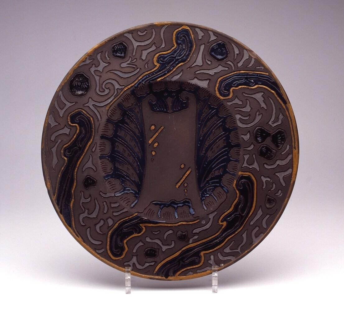 Schotel met een brede, platte rand, met ingekraste decoratie van lineaire motieven op de rand en het wapen van Delft op het plat. Grijs, mat glazuur en blauw en geel Reflet Métallique. (Nederlands)