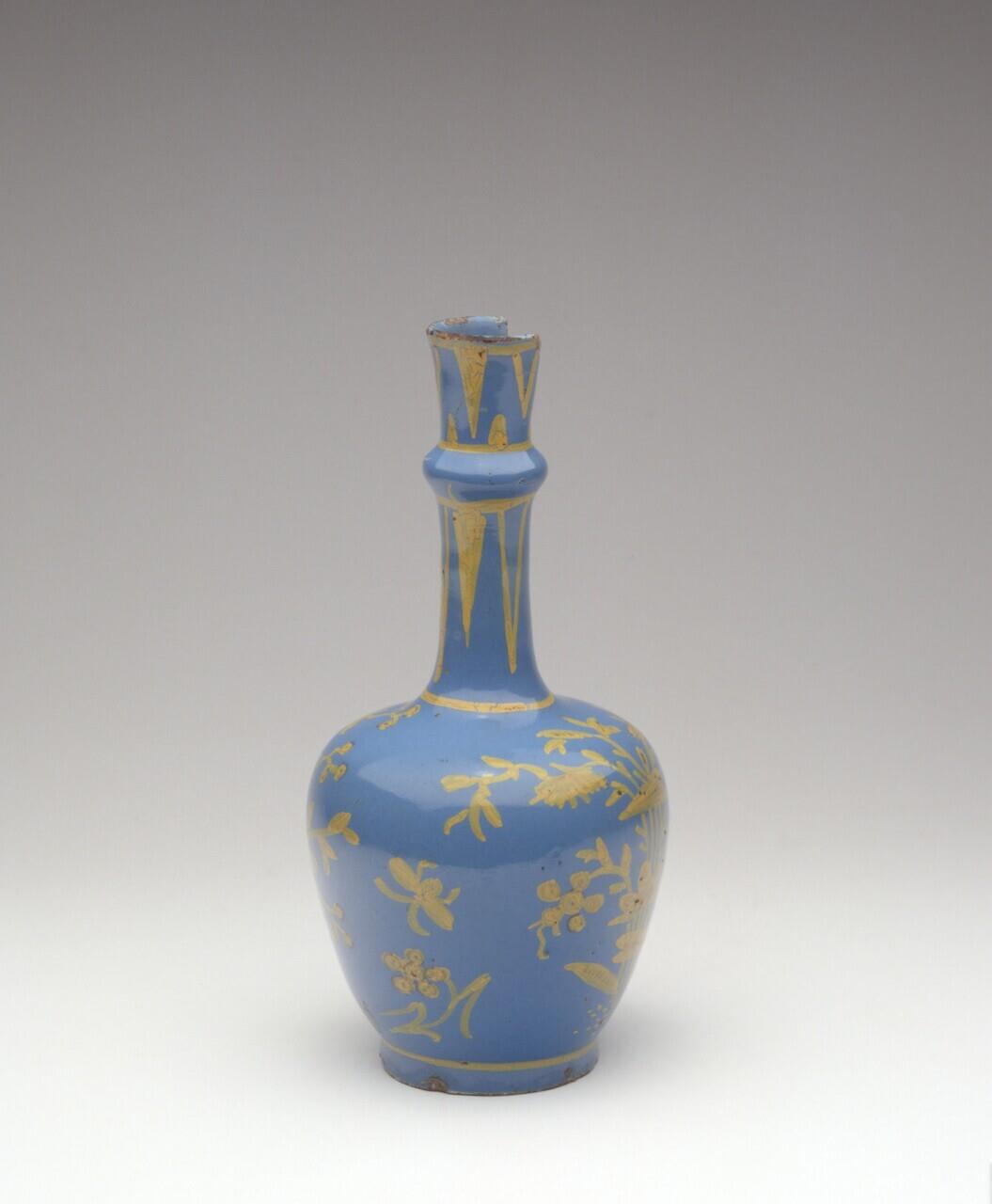 Vaas met lange hals met knobbel, versierd met bloemornament. Schade aan de hals en aan de standring. (Nederlands)