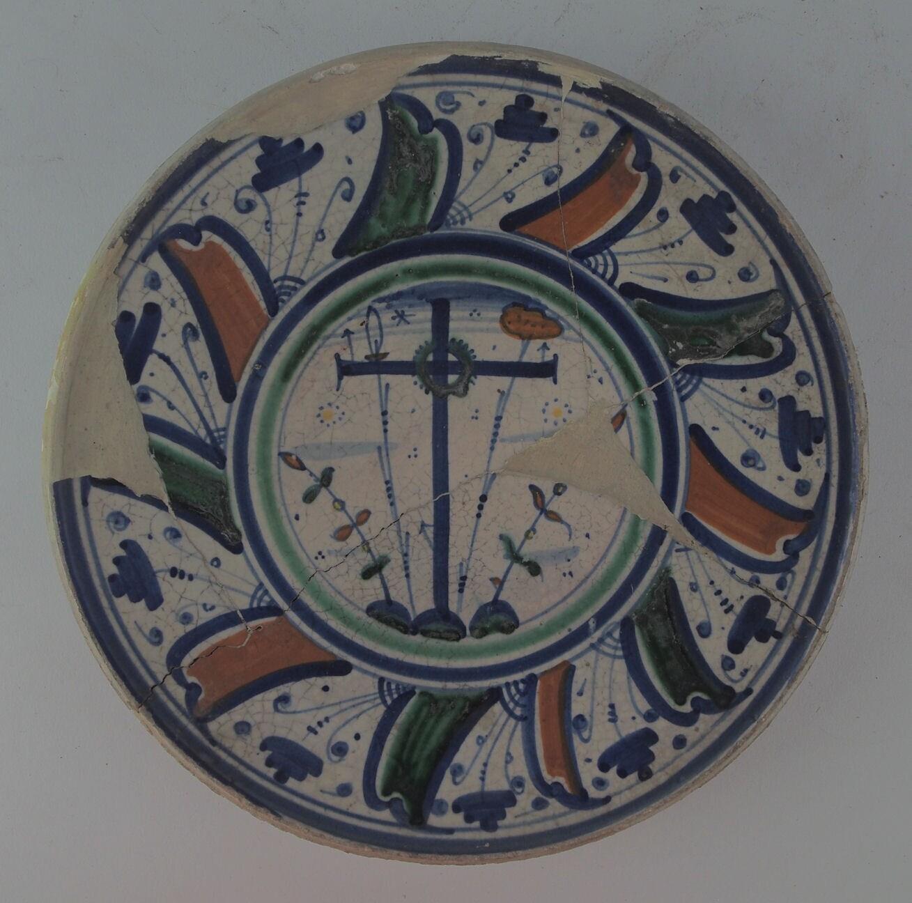 Rond bord met op het plat een kruis op een grondje. Op de rand bladornament en streepjes. Is gerestaureerd. (Nederlands)