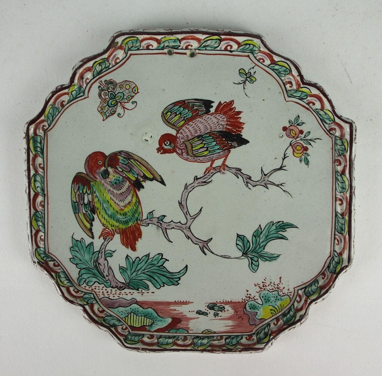 Plaque met geäccoladeerde hoeken. Op de plaque twee vogels op een tak met insecten aan de bovenkant. De rand met blad- en krulornament. Bovenaan 2 gaatjes. Bij de rechter vogel een klein bak foutje. (Nederlands)