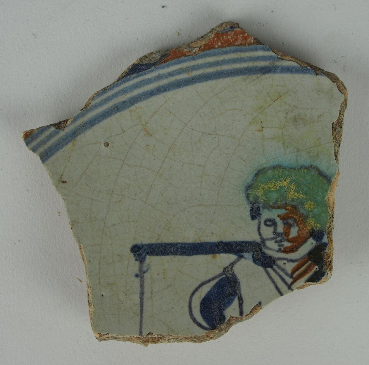 Majolica fragment met op de buitenwand loodglazuur. Polychromie in blauw, oranje en groen van een fragment van een man met juk en emmers (alleen hoofd, schouder en deel juk zichtbaar). (Nederlands)