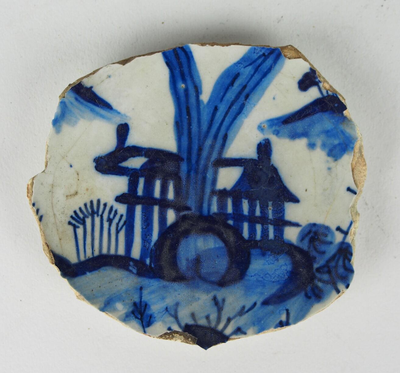 Majolica fragment met een beschildering in blauw van een Chinees landschap met huis. Grijze scherf. (Nederlands)