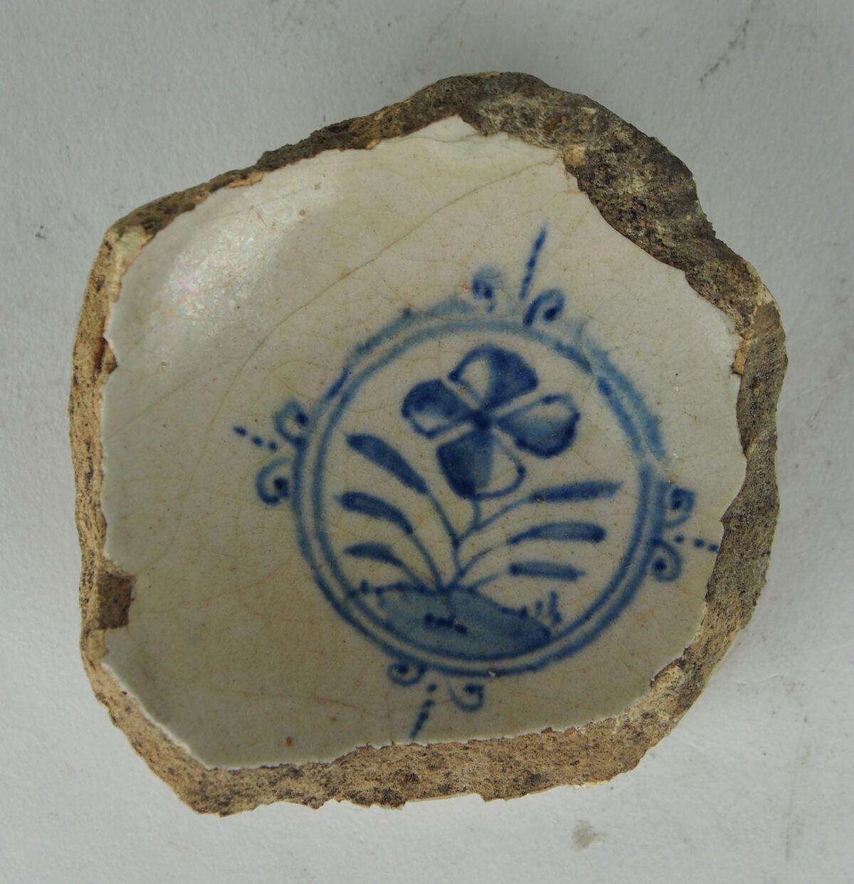 Majolica fragment van bodem met standring met op de buitenwand loodglazuur. Beschildering in blauw onderglazuur van bloemmotief in cirkel. (Nederlands)
