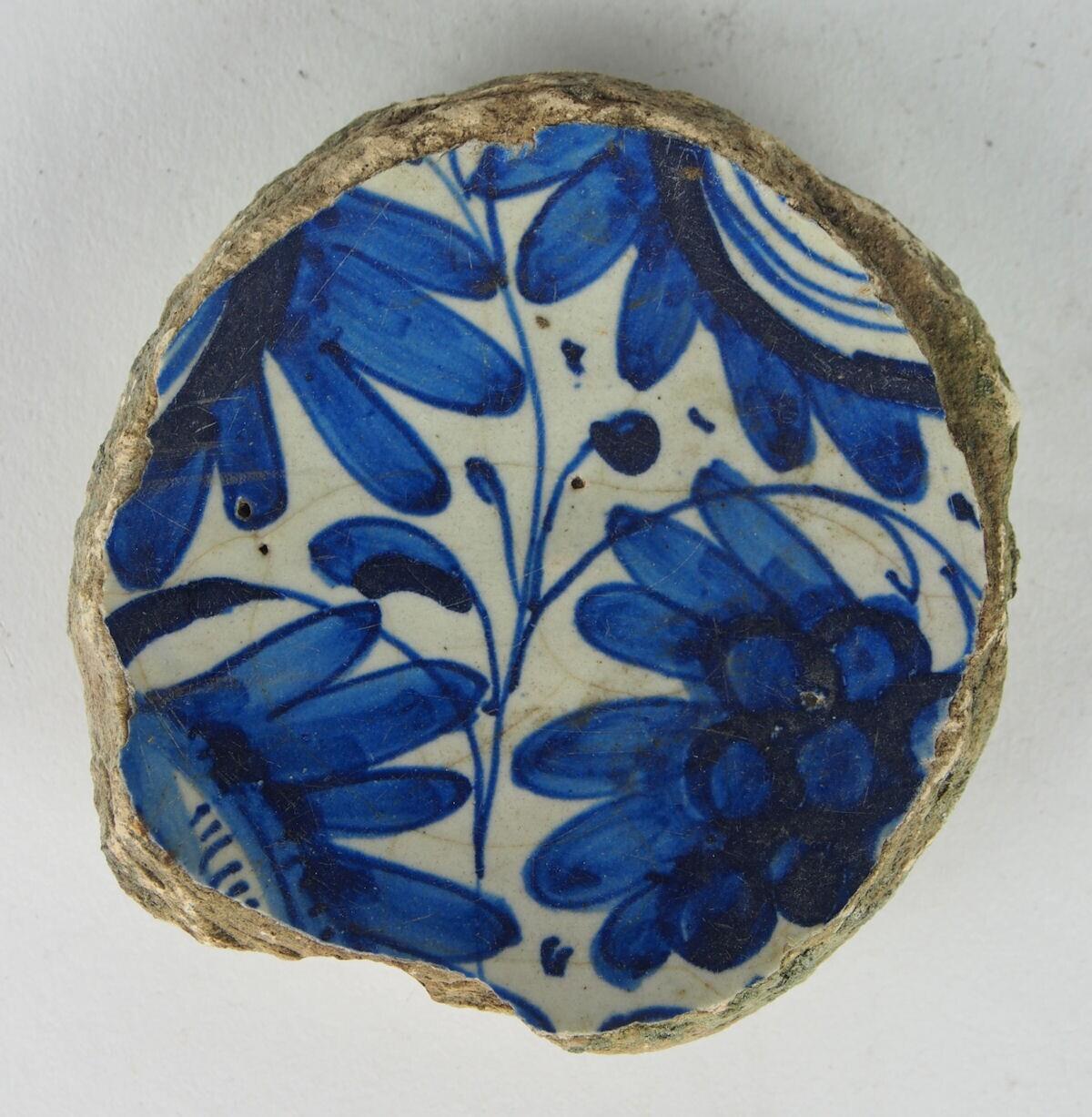 Majolica fragment met op de buitenwand blauwgrijs loodglazuur. Beschildering in blauw van bloemranken. Grijze scherf. (Nederlands)