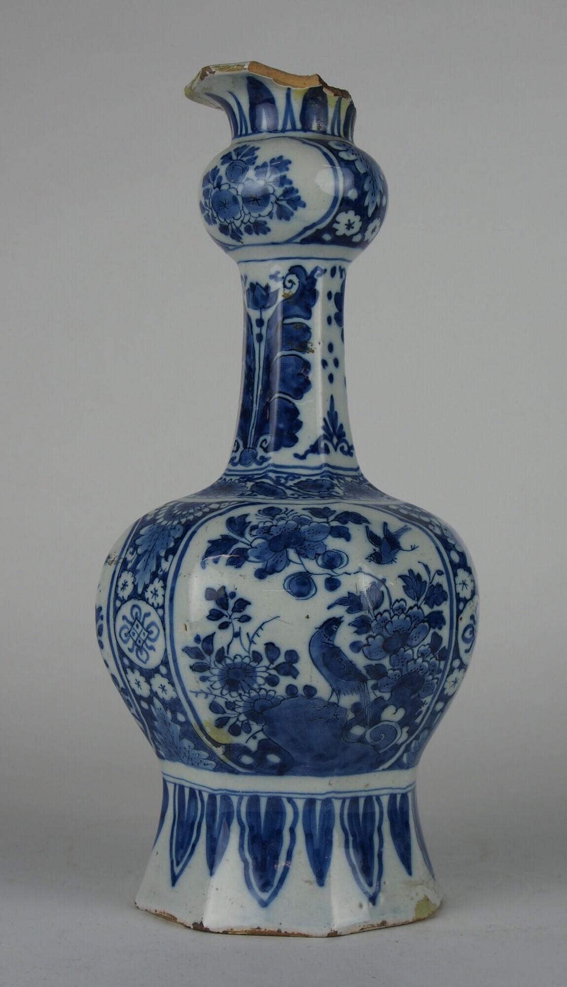 Knobbelvaas of -fles met beschildering in blauw van vakken met florale motieven en vogels. Rondom de hals tulpmotieven. Boven zijde heeft schade. (Nederlands)