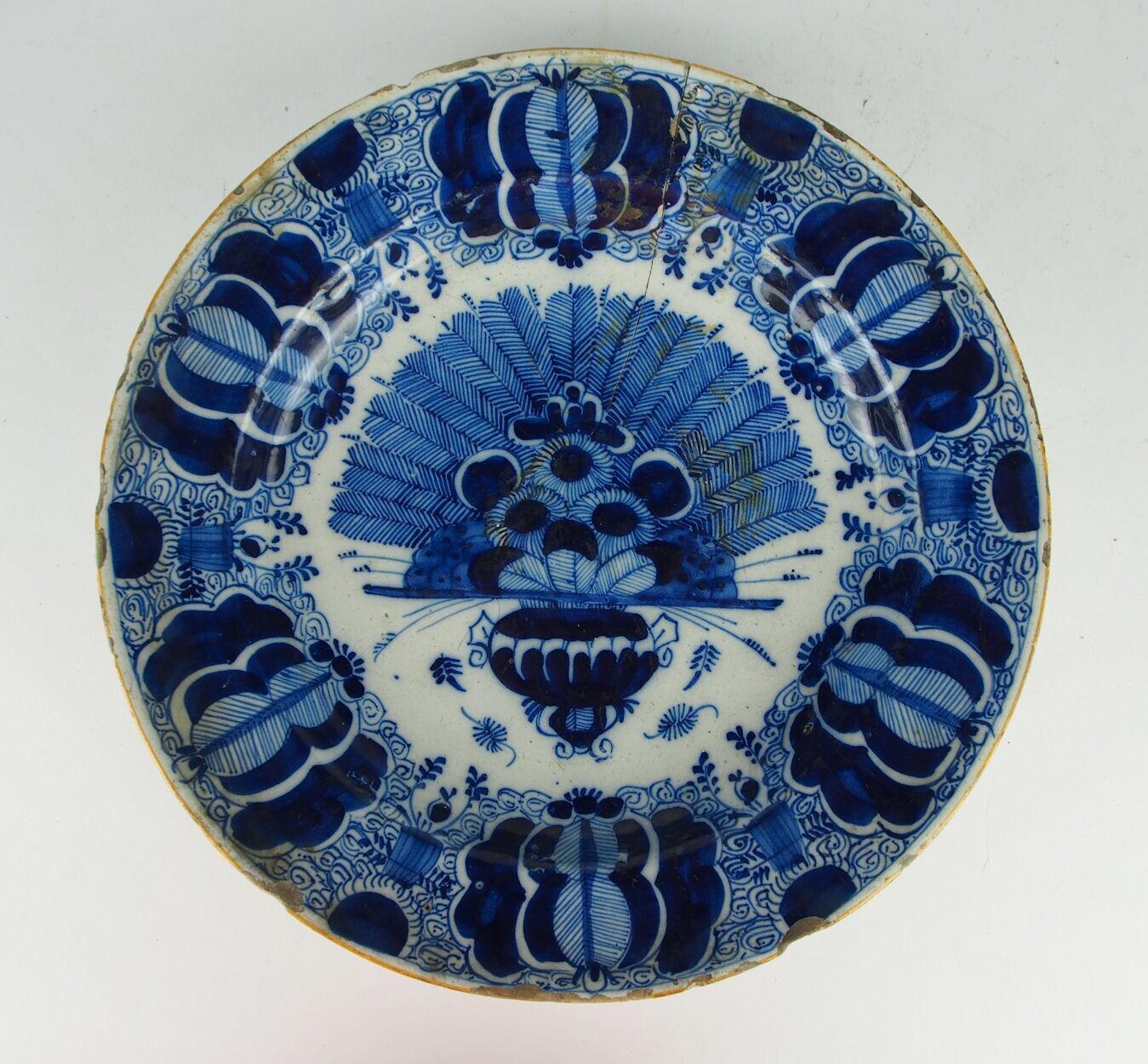 Beschildering in blauw met gele rand. Versierd met een vaas met waaiervormig gerangschikte varens. Is gerestaureerd waarbij de barst nog goed te zien is en randbeschadigingen. (Nederlands)
