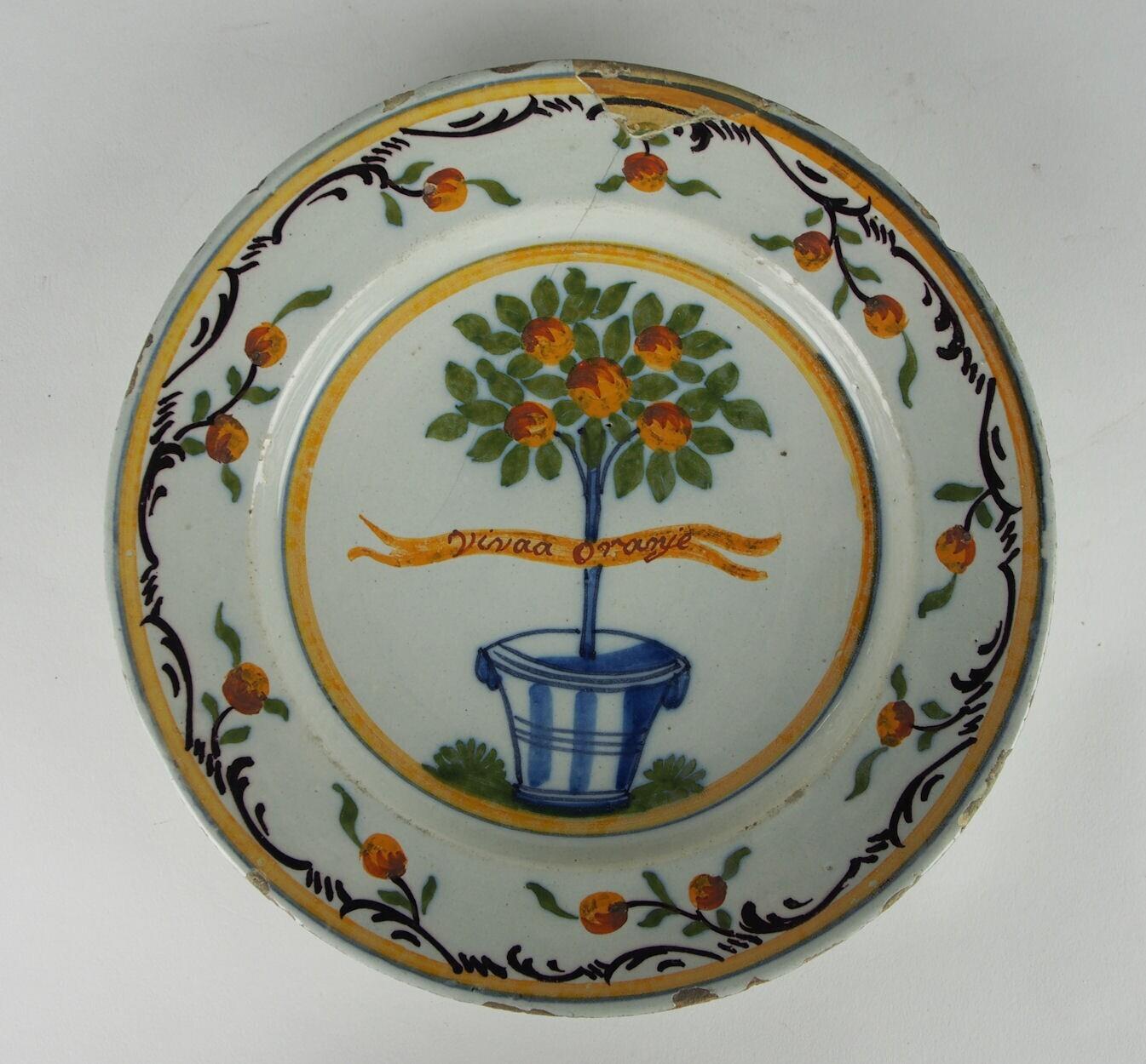 Bord gepolychromeerd in geel, groen, blauw en mangaan. Op het plat een oranjeboompje in pot en het opschrift: VIVAA ORANJE. Op de rand oranje-appeltjes. Randschade, restauratie aan rand. (Nederlands)