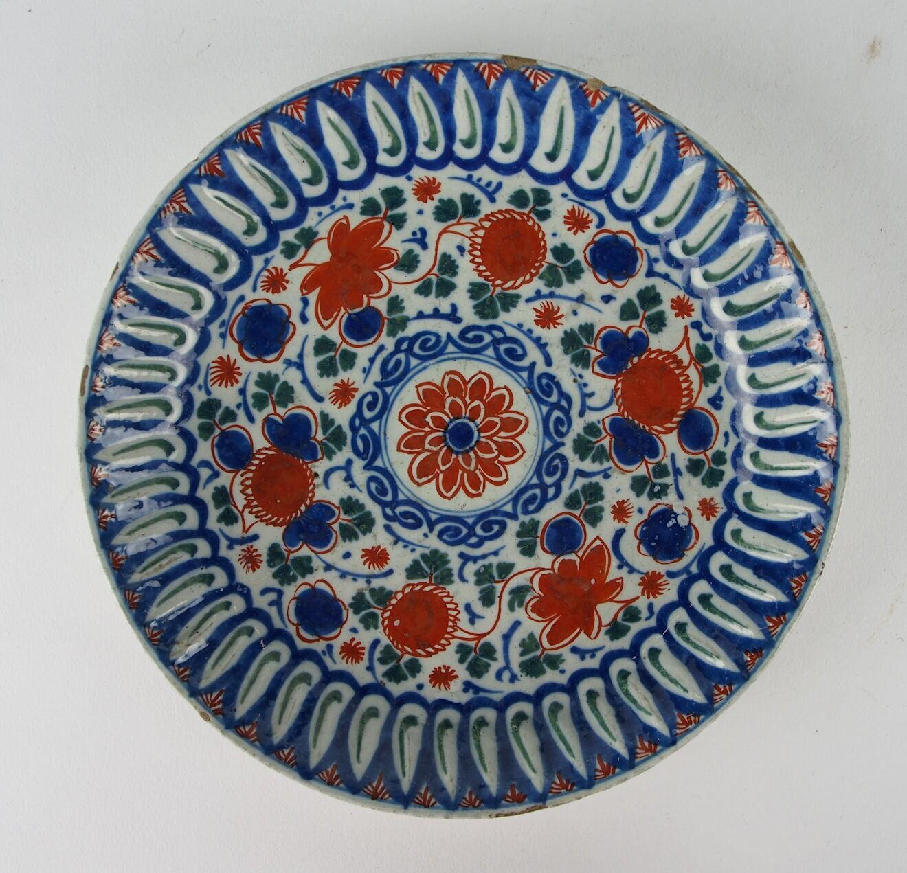 Bord in rood, groen en blauw, met geribde rand. Op het plat een rozet, omgeven door bloemtakken. (Nederlands)