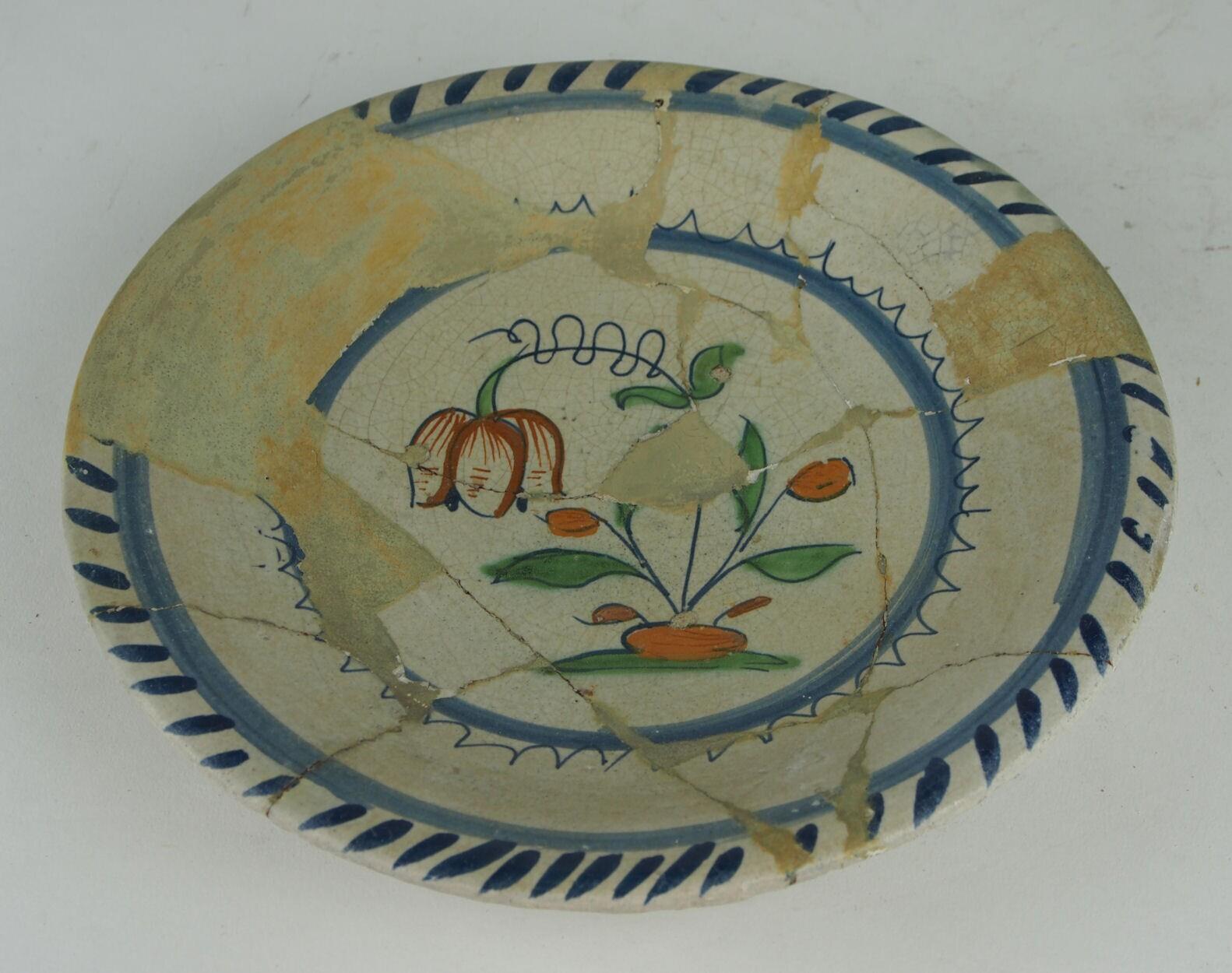 Rond bord met hangende tulp op een grondje in cirkel omlijsting met holgeschulpte rand. Op de rand bladstreepjes. Is gerestaureerd. (Nederlands)
