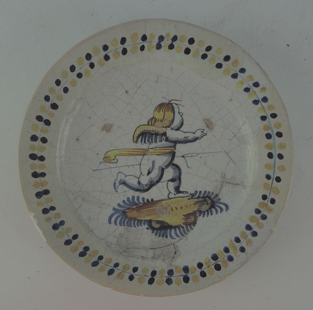 Rond bord in Italiaanse stijl met op het plat een rennende putto op een grondje. Op de rand een dubbele rij stippen. (Nederlands)