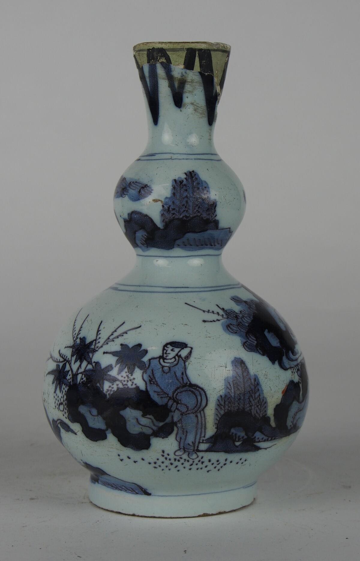 Beschildering in blauw met trek in mangaan van een landschap met Chinees. (Nederlands)