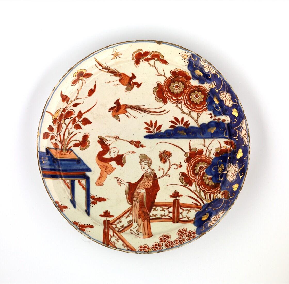 kleuren: rood, blauw en goud. Imari-stijl. Op de voorgrond Chinese vrouw met bloeiende tak in hand, staande achter laag hekje; boven haar een springend zotje (Genius) zwaaiend met tak en twee duikelende vogels; links een gueridon (pronktafeltje) met bloemen; rechts bloeiende pioenrozen. Randbeschadigingen. (Nederlands)