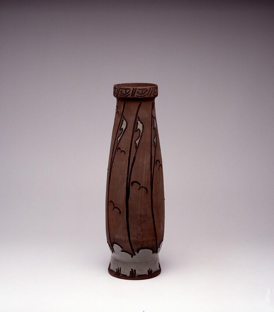 Cilindervormige, zogenaamde Jacoba-vaas met ingekraste lineaire decoratie en bruin en lichtgroen Reflet Métallique. (Nederlands)