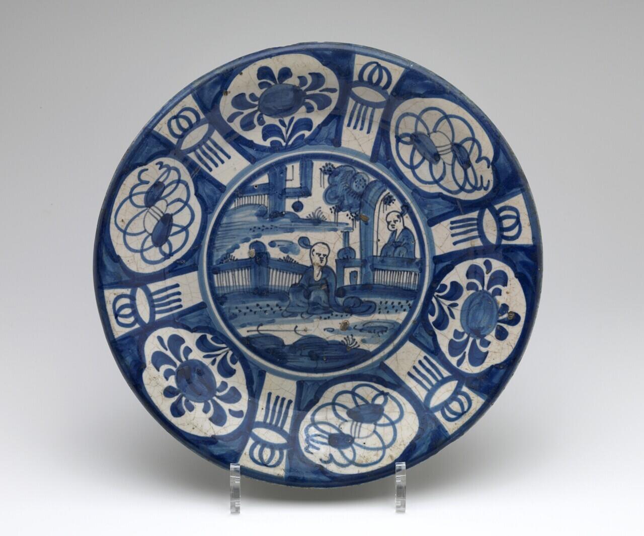 Bord met decor in kraakstijl met op het plat twee Chinezen in een landschap. Op de wand en rand vakken met bloemen en Chinese symbolen. (Nederlands)