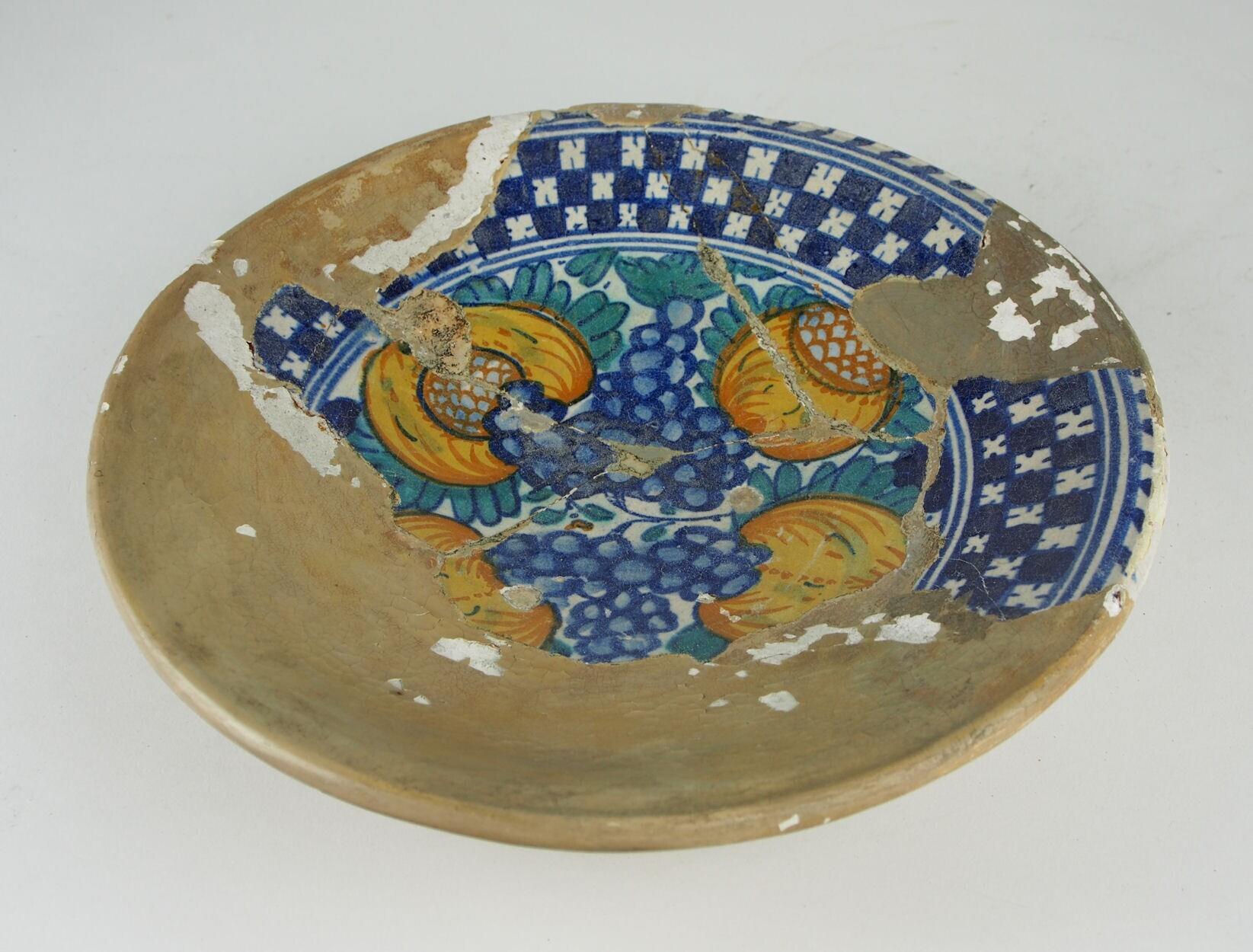 Rond bord met op het plat opengebarsten granaatappels en druiventrossen. Op de wand en rand schaakbordmotief en kabelrand. Is gerestaureerd. (Nederlands)