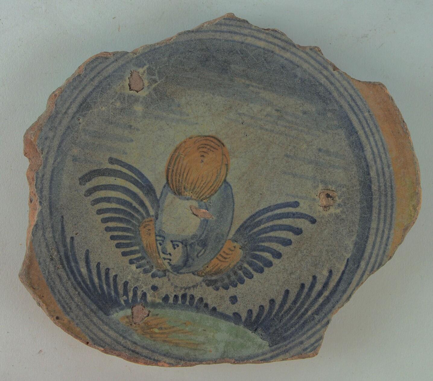 Fragment van een majolica bord gepolychromeerd in blauw en geel. Het plat is versierd met een gevleugeld engelenkopje. (Nederlands)