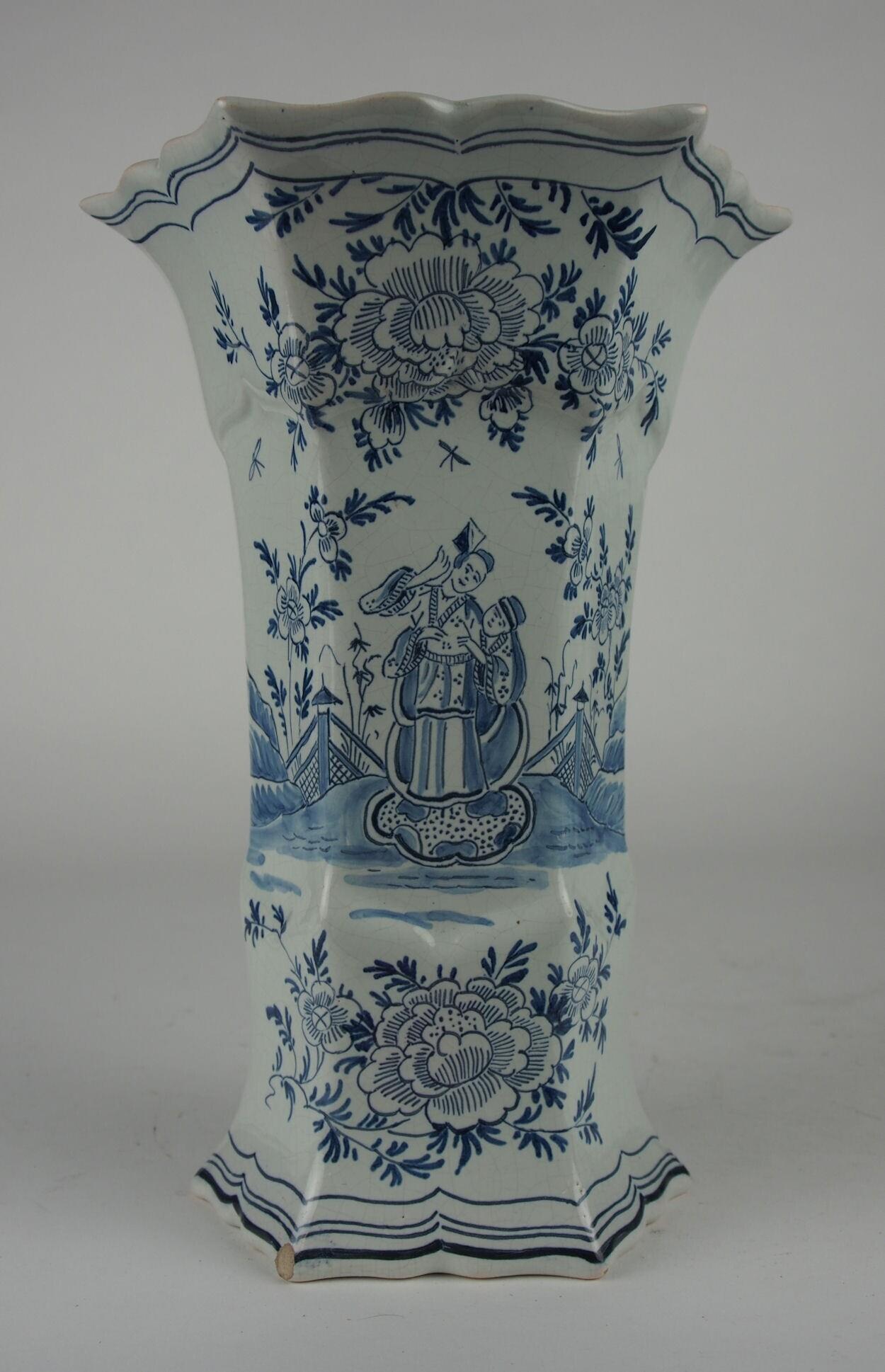 Deze vaas maakt deel uit van een 3 delig kaststel, met 1 dekselvaas en 2 bekervazen.Bekervaas met een voorstelling van een tweetal figuren in een tuinachtige omgeving. (Nederlands)