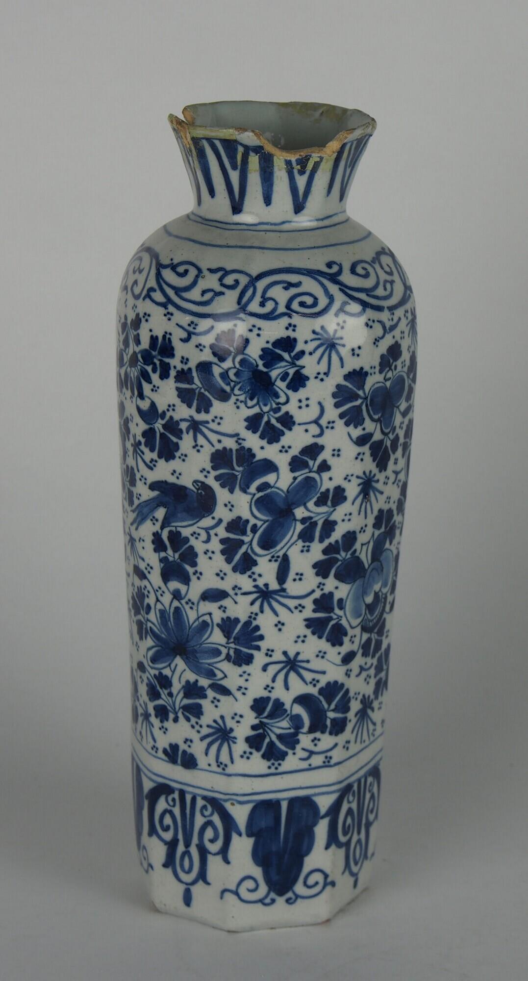 Lange en smalle, achthoekige vaas met beschildering in blauw van florale motieven en vogeltjes. Schade en oude herstel stukken aan de bovenzijde. (Nederlands)