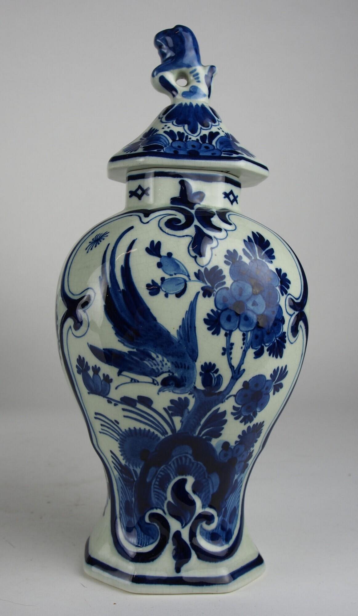 Dekselvaas met een in reliëf uitgevoerd cartouche waarbinnen een op een soort rots weergegeven bloeiende tak en een vogel. Op de deksel een knop in de vorm van een leeuw. Vijfdelig achthoekig kaststel bestaande uit drie balustervormige dekselvazen met op de deksel een leeuw en twee bekervazen met trompetvormige hals. De in reliëf uitgevoerde cartouches op de bekervazen tonen een op een soort rots weergegeven bloeiende tak, waaraan op de potten een vogel is toegevoegd. (Nederlands)