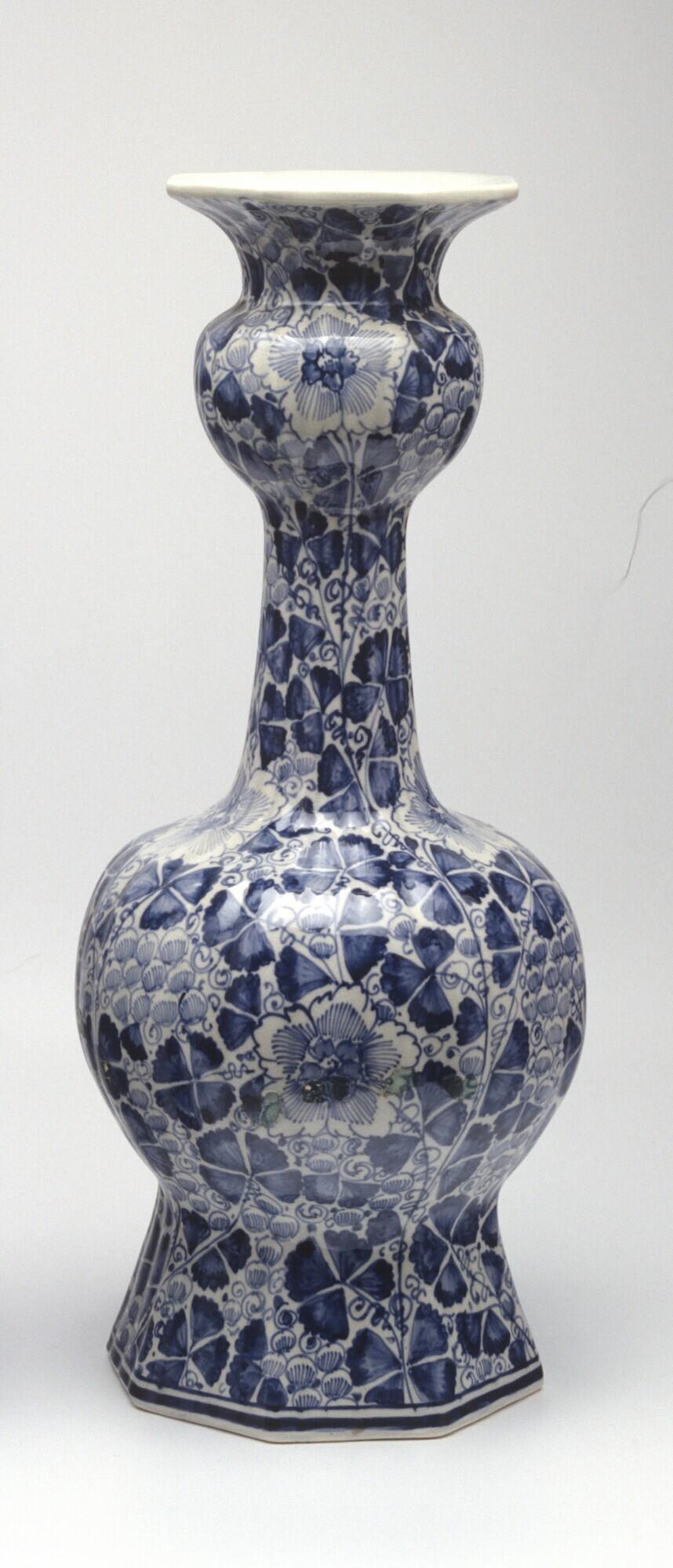 Geribde achthoekige knobbelvaas gedecoreerd met bloem- en bladwerk. (Nederlands)