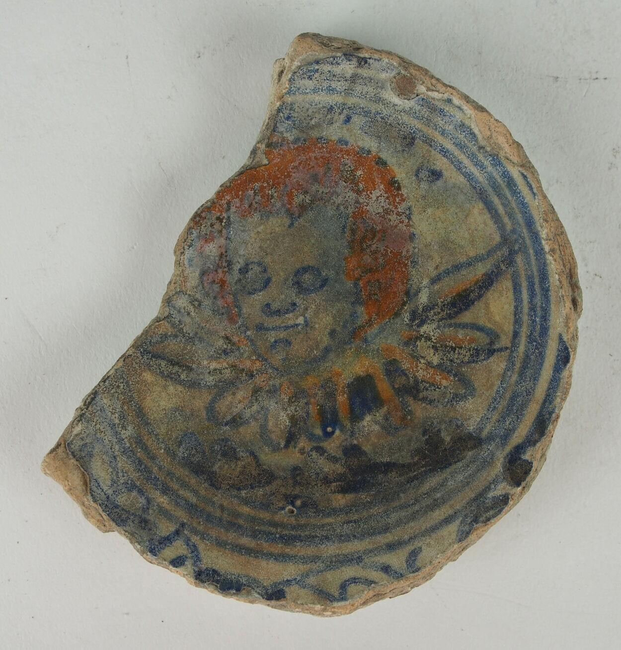 Majolica fragmenten. Op het plat een engelenkop met rood haar en een kraag. (Nederlands)