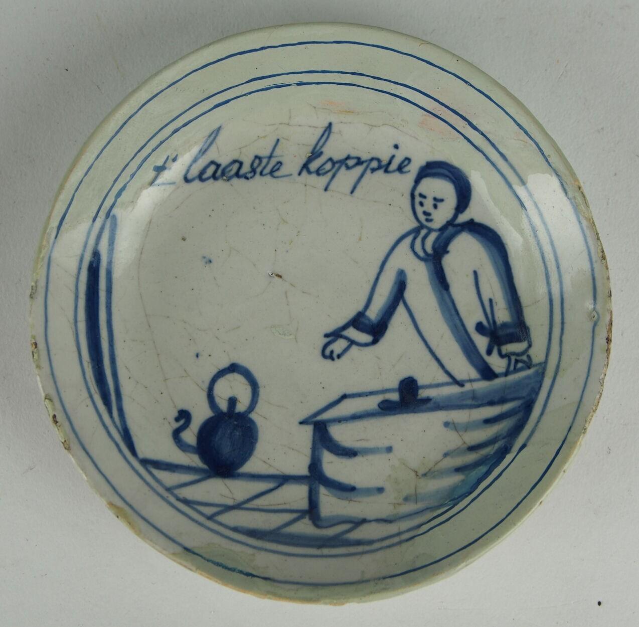 Schotel met op het plat een beschildering in onderglazuur blauw van een Chinees met kop en schotel en opschrift 't' laatste koppie'. Aan de rand zijn missende delen aangevuld. Schade en restauratie aan de randen. (Nederlands)
