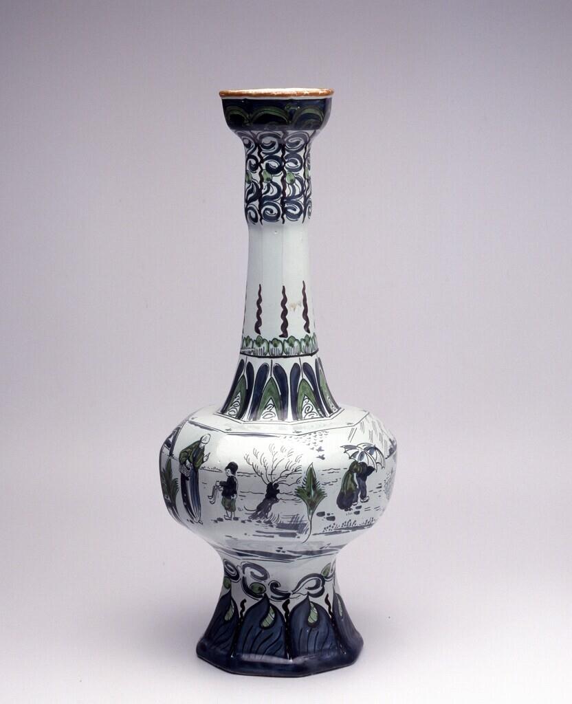 Achthoekige vaas met lange hals en uitbuigende liprand, bolvormige verdikking aan de onderzijde, staande op een uitlopende voet. Gedecoreerd met lineaire motieven en een doorlopende voorstelling van een Hollandse marktscène en een waterlandschap met een vrouw in een bootje in de kleuren groen, grijsblauw en zwart. (Nederlands)