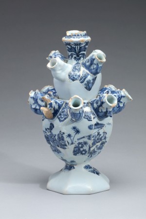 De vaas is opgebouwd uit twee losse segmenten met tuiten in de vorm van een leeuwenkop. Dit is het enige voorbeeld van een klein tweeledig model. Grotere exemplaren bevindt zich bijvoorbeeld in de Delftse van collectie van Dyrham Park en de Koninklijke Musea voor Kunst en Geschiedenis te Brussel, afgebeeld in Gemeentemuseum Den Haag 2007, deel IV, cat.nr. 4.08 en 2.13. Bekender zijn voorbeelden van kleiner formaat met aan elkaar gebakken segmenten. De vorm van op elkaar gestapelde, naar boven kleiner wordende bollen is mogelijk overgenomen van Chinese kalebasvazen, waar ook grote exemplaren met zelfs drie bollen van bekend zijn. Eveneens de tuiten in de vorm van een leeuwenkop zijn geïnspireerd op Chinese voorbeelden. (Nederlands)