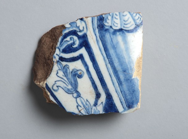 Deze scherf maakte deel uit van de onderzijde van een tuinpot die alternerend beschilderd was met in cartouches weergegeven schelp- en bladmotieven. (Nederlands)