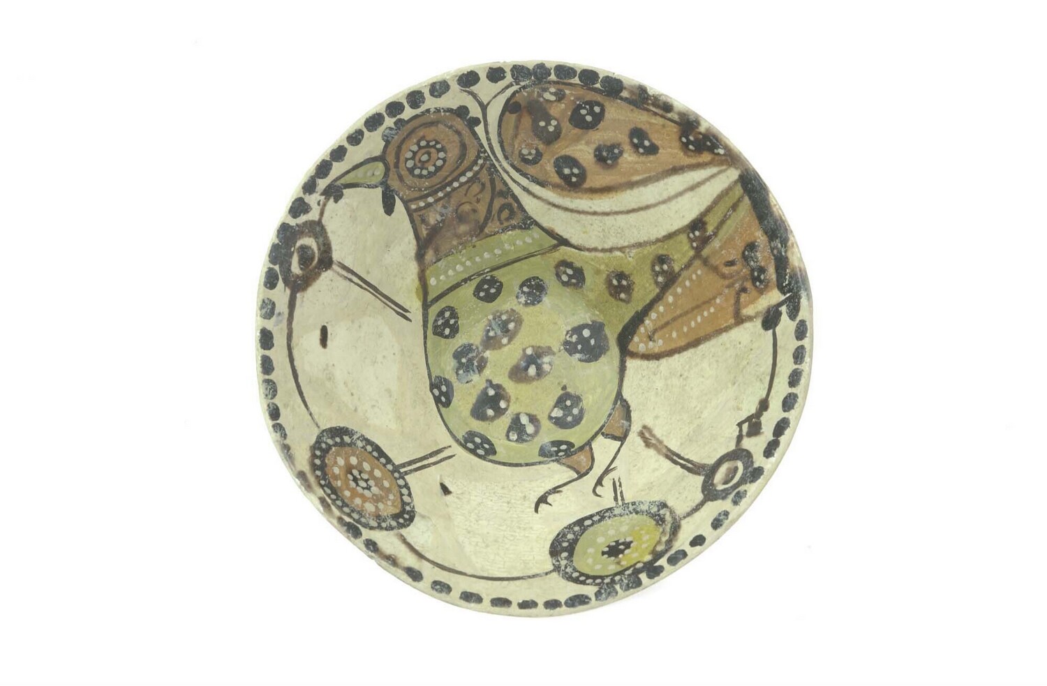 Geglazuurde aardewerken schaal met slibdecoratie met vogelmotief (Nederlands)