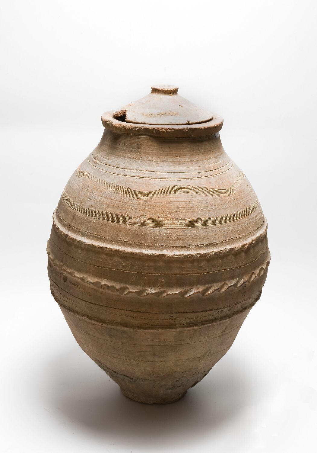 Versierde aardewerken voorraadpot met deksel (Nederlands)