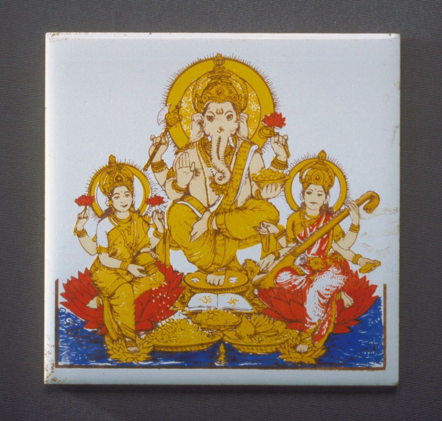 | Nederlands | Geglazuurde tegel voorstellend de Hindoegod Ganesha en zijn twee echtgenotes |